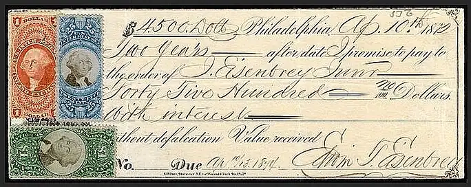 In August 1862, while the American Civil War was being waged, the United States (Union) government began taxing a variety of goods, services and legal dealings. To confirm that taxes were paid a 'revenue stamp' was purchased and appropriately affixed to the taxable item, which would in turn pay the tax duty involved.