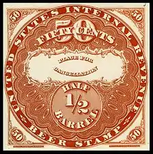 Taxes were commonly levied on alcohol and tobacco products and a variety of such stamps were printed for this purpose. Typically, the stamp would be affixed to a given product when the taxes were paid in such a way as to seal a given container, where upon opening, the stamp would be damaged. For example, revenue stamps for beer tax were issued to brewers in sheet form, where an individual stamp was cut from it and used as a seal over the opening in a barrel of beer. To access the beer the stamp would have to be punctured, thus prohibiting its reuse.[18]