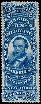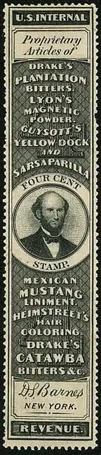 After the tax laws were passed in 1862, private proprietors were allowed to furnish their own stamps, subject to the approval of the Internal Revenue and subsequently were granted a discount on the taxes paid for the goods they sold. Private stamps offered the advantage of having the proprietor's name depicted on the stamp.[34] The proprietor paid the cost of engraving the die and the printing plates which in the beginning varied considerably. Some proprietors paid as little as $60 while others paid as much as $750. After June 1, 1863 a uniform cost of $350 was adopted for all dies with a couple of exceptions for large ones.[35]
