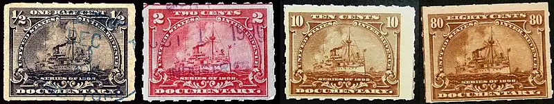 - Issues occur with denominations from 1⁄2-cent to 80-cents depict a battleship