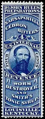 Most of these stamps were printed by Butler & Carpenter of Philadelphia who also printed revenue stamps for the government. Since many stamps would be used to seal a container or packet they were often long in configuration and would be destroyed upon opening. Four types of paper were used to print private die proprietary stamps. They were printed on white, unwatermarked paper up until September, 1871, commonly referred to as "old paper." Some of this paper contained sparsely scattered silk threads and is considered a minor variety or as "experimental silk." The full "silk paper" contains numerous silk threads and was used between 1871 and 1878. "Pink paper" was also used for a brief period between 1877 and 1878. Watermarked paper, bearing the initials USIR was used from late 1877 to the end of the tax period in 1883. To help provide funding for the Spanish–American War the use of private stamps resumed again from July 1, 1898 until July 1, 1902. A variety of patent medicines, wines and other goods like perfumery and cosmetics were taxed, but only a comparatively small number of companies used private die stamps during this period.[34]