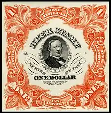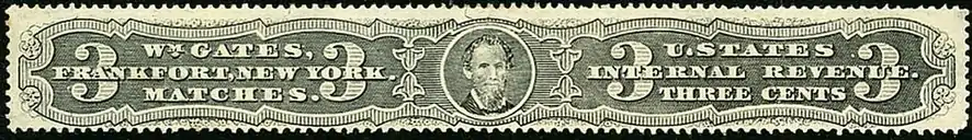The Commissioner of Internal Revenue took bids for the printing and production of the first U.S. revenue stamps in an effort to raise revenue for the great costs of the war.[2][3] The Department of Internal Revenue awarded Butler & Carpenter of Philadelphia the printing contract who were paid $19,080 to produce one hundred and six printing plates, including the rolls, dies and all material necessary to maintain stamp production.[4] Butler & Carpenter soon began producing the first revenue stamps which were issued for use beginning Oct. 1, 1862.[5]