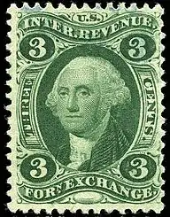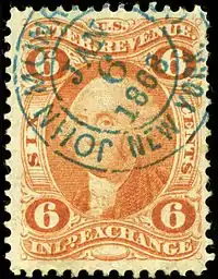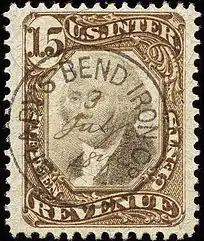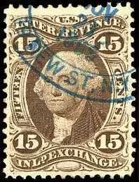 The second issue of revenue stamps were Documentary stamps and issued in 1871. After the Internal Revenue received many reports of the fraudulent re-use of revenue stamps, typically with cancellation ink washed or otherwise removed from the face of the stamp,[13] a letter of May 31, 1867 from government officials in Wall Street was sent to Internal Revenue commissioner E.A. Rollins expressing the concern that "The U.S. government loses thousands of dollars daily by stamps being used a second time." The ordinary stamps in use at this time did not receive the cancellation ink very well, unless it was heavily applied.[14] The letter advised that all stamps be printed in a pale yellow color. This particular suggestion however was not taken up by Butler & Carpenter, but instead, after a period of experimentation, they responded to the problem by producing stamps of a lighter shade and on a paper that more readily absorbed cancellation ink.[14] The Internal revenue was frequently sending stamps suspected of having cancellation ink washed to the engravers and printers for inspection to determine if they had been tampered with.[15]