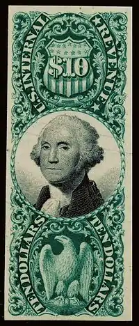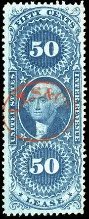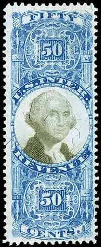 The first series of revenue stamps have two distinctive design types with each stamp designating the tax 'duty'. Designs for denominations 1-cent through 20-cents were simple, bearing a portrait of George Washington, while stamps with denominations 25-cents through 1-dollar are larger and have a more elaborate design and also designate the tax duty in a lower banner. Stamps with denominations of $1.30 were used to pay the tax duty for foreign exchange only, $1.50 for Inland exchange only while the stamps with denominations of $1.60 and $1.90 were for Foreign exchange only and oddly bear no duty designations in the stamp design. Denominations of 2-dollars through 10-dollars have tax duties designated in the lower circular banner surrounding Washington's portrait. Denominations of 15-dollars through 50-dollars have tax duties designated in the right side of the circular banner surrounding the portrait. The design used for the 1-cent denomination is unique and is not used for any other denomination.[11]