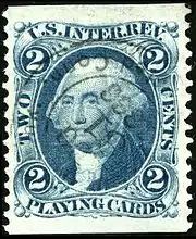 In 1875, the Internal revenue department issued a 2-cent revenue, depicting an allegory of Liberty. Printing of this issue continued into 1878. This was the first U.S. Revenue stamp to be issued that did not bear the portrait of George Washington. The Liberty issue was printed on silk bluish paper. Two types of perforations were added, standard perforations with punctured holes, and rouletted. Stamps produced in 1878 were printed on double-lined watermarked paper.[21] Quantities printed for this issue were great, totaling 228,351,689 stamps, which include both standard and rouletted perforations. The quantities of stamps issued with each type of perforation are not known.[22]