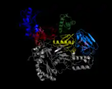 Crystallographic structure of HIV-1 reverse transcriptase where the two subunits p51 and p66 are colored and the active sites of polymerase and nuclease are highlighted.[1]