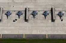 A revetment, in military aviation, is a parking area for one or more aircraft that is surrounded by blast walls on three sides. These walls are as much about protecting neighbouring aircraft as it is to protect the aircraft within the revetment; if a combat aircraft fully loaded with fuel and munitions was to somehow ignite, by accident or design, then this risks starting a chain reaction as the destruction of an individual aircraft could easily set ablaze its neighbours. The blast walls around a revetment are designed to channel any blast and damage upwards and outwards, away from neighbouring aircraft.