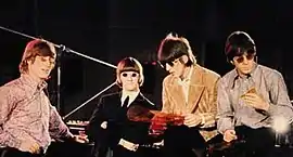 The band had worked on ten songs, including both sides of the upcoming single, by 1 May, when they interrupted the sessions to perform at the NME's annual Poll-Winners Concert.[51][nb 5] At a time when Time magazine dubbed London "the Swinging City", belatedly recognising its ascendance as the era's cultural capital,[53][54] the Beatles drew inspiration from attending concerts by visiting artists, as well as film premieres, plays and other cultural events.[55] From February through June, these musical acts included Stevie Wonder, Roy Orbison, the Lovin' Spoonful, the Mamas & the Papas,[56] Bob Dylan (with whom they socialised extensively), Luciano Berio and Ravi Shankar.[57][nb 6] During mid-May, Lennon and McCartney attended a private listening party for the Beach Boys' Pet Sounds album,[61] and McCartney met Italian director Michelangelo Antonioni, who filmed Blowup in London, inspired by the contemporary fashion scene.[62]