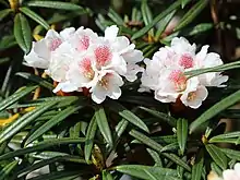 Rhododendron roxieanum is a species of flowering plant in the family Ericaceae, native to central China and Tibet.[2] Its variety Rhododendron roxieanum var. oreonastes, called the mountain rolled-leaf rhododendron, has gained the Royal Horticultural Society's Award of Garden Merit.[3]