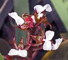 Rhomboda, commonly known as velvet jewel orchids,[3] is a genus of about twenty species of flowering plants in the orchid family Orchidaceae. Plants in this genus are mostly terrestrial herbs with a fleshy, creeping rhizome and a loose rosette of green to maroon coloured leaves. Small resupinate or partly resupinate, dull coloured flowers are borne on a hairy flowering stem. The dorsal sepal and petals overlap and form a hood over the column and there is a deep pouch at the base of the labellum. They are found in tropical regions from northern India through Southeast Asia, China, Japan to Australia and some Pacific Islands.