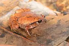 Rhombophryne botabota measure up to 32.2 mm (1.27 in). In life, the dorsal skin is fairly smooth in texture. The lateral head is different in colour from the dorsum, which is unusual among Rhombophryne species.[2] The species' dorsal colouration is variable, sometimes including dark, chevron-like markings, and in other cases being fairly uniformly brown.[2]