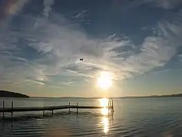 Rice Lake is a lake located in Northumberland and Peterborough counties in south-eastern Ontario. The lake is located south of the city of Peterborough, and the Kawartha Lakes and north of Cobourg. It is part of the Trent-Severn Waterway, which flows into the lake by the Otonabee and out via the Trent. The lake is 28 kilometres (17 mi) long and 5 km wide. Its maximum depth is 10m, with a surface water level at 187 m above sea level, raised to its present height by the Hastings Dam, built in the 19th century as part of the Trent-Severn canal system.[1] Natives called it Pemadashdakota or "lake of the burning plains".