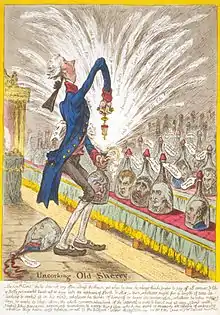 Having quickly made his name and fortune, in 1776 Sheridan bought David Garrick's share in the Drury Lane patent, and in 1778 the remaining share; his later plays were all produced there.[13] In 1778 Sheridan wrote The Camp, which commented on the ongoing threat of a French invasion of Britain. The same year Sheridan's brother-in-law Thomas Linley, a young composer who worked with him at Drury Lane Theatre, died in a boating accident. Sheridan had a rivalry with his fellow playwright Richard Cumberland and included a parody of Cumberland in his play The Critic. On 24 February 1809 (despite the much vaunted fire safety precautions of 1794) the theatre burned down. On being encountered drinking a glass of wine in the street while watching the fire, Sheridan was famously reported to have said, 'A man may surely be allowed to take a glass of wine by his own fireside.'[14] Sheridan was the manager of the theatre for many years, and later became sole owner with no managerial role.