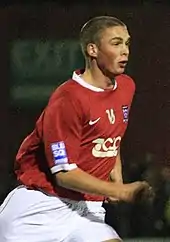 Brodie made his first appearance of 2007–08 after being introduced as a 61st-minute substitute at home to Cambridge United on 11 August 2007, but was unable to help the team as they lost 2–1.[30] His first goal of the season came with the opener in a 3–2 home defeat to Rushden & Diamonds on 30 August 2007, and this was followed up with a goal in the following match, a 2–2 home draw with Altrincham.[31][32] Having not scored since, he received abuse from some sections of the York support during the 6–0 home victory over Rushall Olympic in the FA Cup fourth qualifying round on 27 October 2007.[33] Following this, manager Billy McEwan said "I was disappointed to hear the young players like Richard Brodie getting stick. How can we develop young players if we don't support them?"[34] Brodie and Onome Sodje scored in extra time to give York victory in the Conference League Cup fourth round match away to Stafford Rangers on 22 December 2007, which set a new club record of six successive away victories.[35] Brodie went on to score two goals in stoppage time to give York a 4–3 away win over Droylsden,[36] which drew praise from manager Colin Walker.[37]