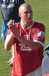 Brodie scored the winning goal for York in a 2–1 away victory over Oxford United in the FA Trophy second round, ensuring their progression to the third round.[46] He scored York's first goal in a 2–1 home win over AFC Telford United in the FA Trophy semi-final second leg, with the tie being won 4–1 on aggregate, which saw the team reach the final at Wembley Stadium.[67] A yellow card picked up against Kidderminster Harriers on 28 March 2009 resulted in Brodie receiving a two-match suspension, meaning he would miss matches against Grays and Oxford, after being booked on 10 occasions during the season.[68] He returned to the team for a 2–1 home defeat to Northwich on 11 April 2009, and during this match he was fouled in the penalty area, with the penalty kick being scored by Mark Robinson.[69] Brodie scored against Weymouth in a 2–1 away victory on 24 April 2009, which ensured York's survival in the Conference Premier.[70] They finished the season 17th in the table.[71] Brodie started in the 2009 FA Trophy Final at Wembley Stadium on 9 May 2009, which York lost 2–0 to Stevenage Borough.[72] He finished the season as York's top scorer with 19 goals in 46 appearances,[46] and in May 2009 the club exercised its option to extend his contract for 2009–10.[73]