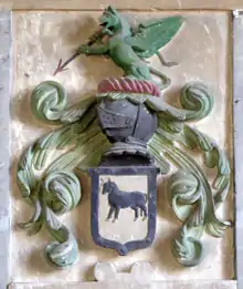 His large monument with semi-recumbent effigy dressed in armour survives in All Hallows Church, Woolfardisworthy. The monument was said in 1978 to retain the original paintwork.[26] The Latin inscription etched onto a slate tablet is largely worn away.[27]