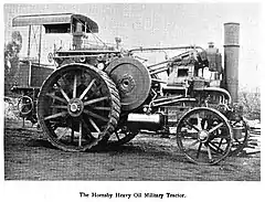Following military traction engine trials in 1902, the military authorities were looking for a tractor that could do what the steam tractor achieved without its demands on fuel and water. In 1903 the military held a competition with £1000 first prize for a tractor that must weigh under 13 tons ready for the road, could haul 25 tons for 40 miles at 3 mph average speed including gradients of 1 in 18, and should be capable of 8 mph with half load and be able to climb 1 in 6 slopes towing that half load. Other conditions included winch capability of 15 tons, and ability to cross 2 feet of water. The results of the trial were reported in The Automotor Journal.[1] When the trials were held only one vehicle attended, the Hornsby Heavy Oil Tractor. Not only did it win the £1000 prize for meeting the criteria laid down, but it received a bonus of £180 for completing 58 miles towing its 25-ton load before requiring fuel or water.