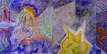 Richard Loving (1924–2021) was an American artist and educator, primarily based in Chicago, Illinois.[1][2] He gained recognition in the 1980s as a member of the "Allusive Abstractionists," an informal group of Chicago painters, whose individual forms of organic abstraction embraced evocative imagery and metaphor, counter to the dominant minimalist mode.[3][4][5][6] He is most known for paintings that critics describe as metaphysical and visionary, which move fluidly between abstraction and representation, personalized symbolism taking organic and geometric forms, and chaos and order.[7][2][8] They are often characterized by bright patterns of dotted lines and dashes, enigmatic spatial fields, and an illuminated quality.[7][9][10][3] In 2010, critic James Yood wrote that Loving's work "mull[ed] over the possibilities of pattern and representation, of narrative and allegory" to attain a kind of wisdom, transcendence and acknowledgement of universals, "seeking understanding of self within the poetics of the physical world."[11]