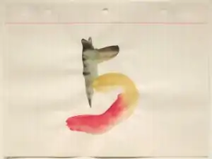 In the early 1980s, Tuttle embarked on an extensive series of suites of watercolors, The Loose Leaf Notebook Drawings. Each sheet consisting of a few strokes on low-grade loose leaf paper. The paints bleed and pooled, causing the paper to buckle, giving the works three-dimensionality.[11] The illustration from the suite 5 Loose Leaf Notebook Drawings from 1980 to 1982, in the collection of the Honolulu Museum of Art, demonstrates how the suites challenge viewers to contemplate the distinction between fine art and trash. His works in the 1990s consisted mostly of smaller-sized work, followed by bodies of low-relief wall-bound pieces that integrate painting, sculpture, and drawing.[8]