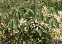 The mongongo tree, mongongo nut or manketti tree (Schinziophyton rautanenii) is a member of the family Euphorbiaceae and of the monotypic genus Schinziophyton. A large, spreading tree, the mongongo reaches 15–20 metres tall. It is found on wooded hills and among sand dunes, and is associated with the Kalahari sand soil-types. The leaves are a distinctive hand-shape, and the pale yellow wood is similar in characteristics to balsa, being both lightweight and strong. The yellowish flowers occur in slender, loose sprays.
