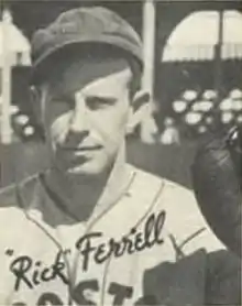 In 1934, the Red Sox signed Ferrell's brother Wes, forming a formidable battery for the next three and half seasons.[1] Rick ended the year with a .297 batting average and led the league's catchers in fielding percentage and in putouts and finished second in assists.[2] With Ferrell calling the pitches in 1935, his brother pitched to a 25–14 won–loss record,[4] and was runner-up to Hank Greenberg in voting for the 1935 American League Most Valuable Player Award.[18] Ferrell posted a .301 batting average for the year and led the league in baserunners caught stealing.[2]