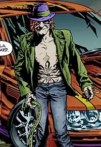 Riddler eventually formed his team, consisting of himself, Poison Ivy, Scarecrow, Deathstroke, Clayface, Killer Croc, Two-Face, Firefly, and Victor Zsasz.[34] Waging war on Joker's team across Gotham, Riddler is responsible for poisoning Charles Brown's son, resulting in his transformation into Kite Man who joins up with Joker's team consisting of Cluemaster, Deadshot, Mad Hatter, Man-Bat, Mr. Freeze, Penguin, Solomon Grundy, and Ventriloquist.[35] The war continues, with Riddler and Joker claiming territories across Gotham, before Riddler, who had convinced Batman to side with him during the conflict, blackmails and interrogates Kite Man into giving up Joker's location. However Batman, after a brief fight between him, Riddler and Joker, becomes disgusted by Riddler's actions and quickly grabs a blade, breaking his one rule of no killing to stab Riddler. However, Joker, who finally begins to laugh again, prevents Batman from doing so.