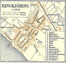 The station opened on 31 March 1875 as the section from Holstebro to Ringkøbing of the new Esbjerg–Struer railway line opened.[4] Later the same year, on 8 August, the section from Varde to Ringkøbing also opened. The West Jutland longitudinal railway line was thus completed, and connected Ringkøbing to the rest of Denmark's railway lines at both ends.[4]