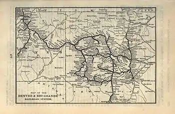 The original ambitious plans of Denver and Rio Grande Railway founder William J. Palmer projected a 2,400-mile (3,900 km) north-south narrow gauge route from Denver to Mexico City following the course of the Rio Grande for much of the distance.[2][4]: 2, 109 As early as 1878 it was reasoned that such a route would not be possible, but Palmer did receive a concession in September 1880 from the Mexican government to build a different north-south line, the National Railroad of Mexico.[5] Initially planning to access the Territory of New Mexico via Raton Pass, a route that the AT&SF had already begun grading for the construction of its own east-west transcontinental route, the D&RG had to look for alternative routes to the south as its conflict with the ATSF festered.[4]: 4, 109 The conflict eventually resulted in the D&RG shifting its attention to lucrative mining opportunities to the west.[6] Palmer's "dream of a road to Mexico City finally went glimmering" but the line along the Rio Grande became the exotic southern extent of the D&RGW's famous network in the Rocky Mountains.[2] Prior to the conflict, the D&RG had built tracks over La Veta Pass to Alamosa in the San Luis Valley.[4]: 109 By 1880 narrow gauge tracks were in place as far south as Antonito and the construction of a line towards Albuquerque was underway.[2][4]: 109