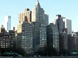 The 26-story River House was constructed in 1931 on the site of a former cigar factory and designed by William Lawrence Bottomley in the Art Deco style.[3][4][5] Designed for cooperative ownership, the building featured 78 apartments with 12 rooms, 6 baths, and two fireplaces.[6] Originally, the building featured a pier where residents could dock their yachts, but that amenity was lost with the construction of the FDR Drive. The building has a gated cobblestone courtyard featuring a fountain.[3]