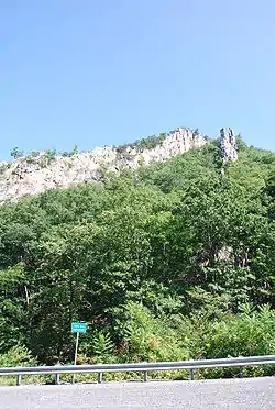 The exposed rock of the River Knobs is a tough quartzite, Tuscarora Sandstone, an extremely hard sedimentary rock, ranging in color from a nearly translucent white, to gray, pink or orange. Laid down as sediment on a sea floor 440 million years ago, in West Virginia the Tuscarora is 150 to 250 feet (76 m) thick. At the River Knobs, the quartzite layer has been "verticalized" by geological forces during the formation of the Appalachians some 230 million years ago. A folding of the Earth's crust forced this layer - and the surrounding strata - into enormous arches, miles wide. The River Knobs trace the western wall of this arch, or anticline, where the Tuscarora was turned a full 90 degrees from horizontal to vertical. Over time, erosion stripped away the softer rock covering the arch, and finally the dome of the arch itself. The tough quartzite of the western walls resisted this process, leaving the soaring "fins" - narrow vertical plates of exposed rock. About 2 miles (3.2 km) east, along the top of North Fork Mountain, the horizontal strata of the far slope of the Tuscarora anticline are also visible. (Within this eroded anticline lies Germany Valley, registered as a National Natural Landmark because of its unique karst topography.)