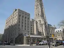 Morningside Heights, where the new church was to be located, was being quickly developed as a residential neighborhood surrounded by numerous higher-education institutions, including Union Theological Seminary and International House of New York.[30][31] The development had been spurred by the presence of Riverside Park and Riverside Drive nearby, as well as the construction of the New York City Subway's Broadway–Seventh Avenue Line—the modern-day 1 train—under Broadway.[19][30] Rockefeller briefly considered a location on Morningside Drive on the eastern edge of Morningside Heights, between 117th and 118th Streets.[22] He ultimately chose a larger site at the southeastern corner of Riverside Drive and 122nd Street on the neighborhood's western border, which overlooked Riverside Park to the west and Claremont Park to the north.[31][32] Rockefeller felt the Riverside Drive site was more easily visible because it abutted the Hudson River and would be seen by recreational users of Riverside Drive.[32]