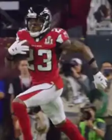 On February 5, 2017, Alford recorded 11 combined tackles, an interception, fumble recovery, and touchdown as the Falcons lost to the New England Patriots 34–28 in overtime. His touchdown came off an 82-yard return after intercepting quarterback Tom Brady in the second quarter.[35][36][37] Alford was involved in a notable play with Patriots wide receiver Julian Edelman, who completed a very difficult catch off of Alford's shoe. Alford deflected Brady's throw into the air behind him, and Keanu Neal and Ricardo Allen merged on the ball to try an intercept it or knock it down. The ball bounced off Alford's left leg and almost into the turf, but Edelman caught it a mere centimeters off the ground. This play set up the Patriots on the Falcons side of the field and allowed them to continue the eventual game-tying drive.