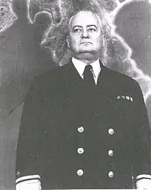 ![]() Rear Admiral Robert A. "Fuzzy" Theobald standing in front of a map of Kiska in 1942. | |