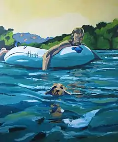 The representational style of Brokl's early work in the 1970s reflected his interest in recording and expressing his experience as a gay man, as well as the influence of California, and often depicted naturally lit people at leisure and on the beach.[23] Prior to earning his MFA degree, he frequently drew critical attention for paintings and works on paper in juried annuals and group exhibitions, including notices from Bay Area critics Victoria Dalkey, Cathy Curtis and Thomas Albright and The Advocate for the rawness and "blunt strength"[34] of his figurative work and leisurely, off-guard nudes (e.g., Self-Portrait with Pink Sky and Al and Ludwig – Russian River, both 1980).[35][36][25][23]