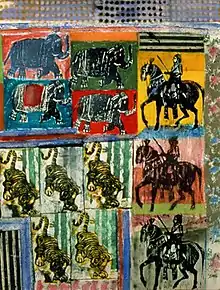 Brokl's later printmaking—like his painting—explores travel, animals and pets, and art itself and often combines woodblock printing, drawing, collage, painting and stencils (e.g., 9 Roosters, 2004; Weller Frog and Albers Painting, 2011; or David, 1992).[3][27][45][46][13] India XIII (1996) offers a characteristic work in this vein, with a layered, gridded format combining expressive gesture and crudeness in its repeated tiger, rider and elephant images and delicacy in its flower, rabbit and abstract woodblock patterns created with Indian fabric printing blocks.[47]