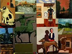 In the 1990s, and 2000s, Brokl's painting and drawing has often been inspired by travels to Greece, India, Italy, Morocco and Spain; this work often fuses multiple images in surrealist-like collages, "puzzles" or grids that suggest narrative, dream states and the contemporary bombardment of sensations, as in the large oil, Midwest VI/VII (2001).[31][51][52][26] His exhibitions at the SFMOMA Artist Gallery (1993, 1999) and paintings in the 1994 show "Dream Riddle" featured fragments of masterworks, such as Michelangelo's David, as well as Greek vases, Roman sculpture and Indian miniatures, which function as symbolic icons in meditations on mortality, human existence and the AIDS crisis.[31][53][51] Writer Jennifer Modenessi describes the show, "Viaggi Artistici" (2002, with M. Louise Stanley) as a "fantastic voyage where past and present overlap and collide", noting his "Egypt" series, which combines impressionistic images of outdoor monuments, museum interiors and silhouettes of tourists.[52][26] In the 2000s, Brokl has also explored portraiture (e.g., Joan Brown, 2005), often in multi-panel formats (e.g., Six Modern Heads I, 1999).[54][55]