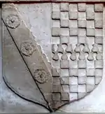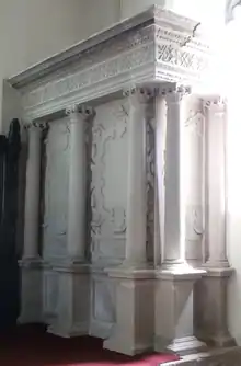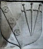 His large monument, with strapwork decoration, survives against the south wall of the chancel of All Saints Church, Clovelly. Along the full length of the cornice is inscribed in gilt capitals: Robertus Carius, Armiger, obiit An(no) Do(mini) 1586[8] ("Robert Cary, Esquire, died in the year of Our Lord 1586"). On the base of the north side are shown two relief sculpted heraldic escutcheons, showing Cary impaling Chequy argent and sable, a fess vairy argent and gules[9] (Fulkeram, for his father) and Cary impaling Sable, three swords pilewise points in base proper pomels and hilts or (Poulett, for his grandfather). On the base of the west side is a similar escutcheon showing his own arms of Cary (of four quarters, 1st: Cary; 2nd: Or, three piles in point azure (Bryan);[10] 3rd: Gules, a fess between three crescents argent (Holleway);[11] 4th: A chevron (unknown, possibly Hankford: Sable, a chevron barry nebuly argent and gules[12]) impaling Gules, a chevron or between three millets hauriant argent (Milliton, canting arms, a "millet" in heraldry being a type of fish, possibly a mullet)[4])