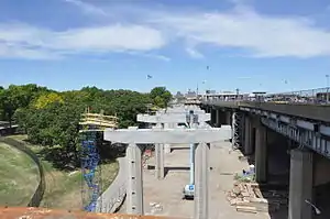 The interchange plaza connects with the over-water spans via a three-legged concrete viaduct that has a total length of more than 2.5 miles (4.0 km). The segments of the viaduct rest atop steel girders, which in turn are placed perpendicularly between concrete piers spaced 60 to 140 feet (18 to 43 m) apart.[21] Each pier is supported by a set of three octagonal columns. The viaduct is mostly eight lanes wide, except at the former locations of the toll plazas, where it widens. The viaduct once traversed Little Hell Gate, a small creek that formerly separated Randalls Island to the north and Wards Island to the south; the waterway has since been filled in.[25] The viaduct rose 62 feet (19 m) above the mean high water of Little Hell Gate.[23]