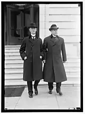 Owen worked unsuccessfully after the war to salvage Wilson's hopes for U.S. participation in the League of Nations.[94] In January 1920, at a time when the ailing Wilson himself refused to countenance any U.S. reservations to the league's Covenant, and the influential Republican Senator Henry Cabot Lodge refused to accept membership without reservations, Owen issued a call for bipartisan compromise. A small group from both parties (including Lodge) then made substantial progress towards agreement, against Wilson's intense opposition.[95] However, when the "irreconcilable" anti-League Senator William Borah learnt of the bipartisan discussions, he pressured Lodge into pulling out.[96]