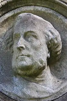 His body was returned to Edinburgh for burial and he is buried in the south-east section of Grange Cemetery in southern Edinburgh. The pale sandstone monument, bearing his head in high relief, was sculpted by John Hutchison.