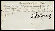 Out of public office for the first time since the start of the American Revolution, Morris focused on expanding his shipping business. He partnered with several out-of-state businessmen, including Jonathan Hudson of Maryland and Carter Braxton and Benjamin Harrison of Virginia, to form what biographer Charles Rappleye calls "the first national conglomerate." In these trading ventures, Morris often provided financing and oversight but left the details to his partners.[66] With national finances in tatters, Morris led a group of merchants in creating the Bank of Pennsylvania, which provided funding for the purchase of supplies by the Continental Army. The bank did not engage in the full range of modern banking activities, but it did accept deposits and provide a potential model for monetary reforms at the national level.[67] The success of the bank provided a boost to Morris's popularity, and in October 1780, he won election to the state legislature.[68]