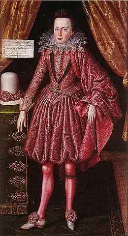 Sheeran believes that Peake's creativity waned into conservatism, his talent "dampened by mass production". He describes Peake's Cambridge portrait, Prince Charles, as Duke of York as poorly drawn, with a lifeless pose, in a stereotyped composition that "confirms the artist's reliance on a much repeated formula in his later years".[46] Art historian and curator Karen Hearn, on the other hand, praises the work as "magnificent" and draws attention to the naturalistically rendered note pinned to the curtain.[54] Peake painted the portrait to mark Charles's visit to Cambridge on 3 and 4 March 1613, during which he was awarded an M.A.—four months after the death of his brother.[65] Depicting Prince Charles wearing the Garter and Lesser George, Peake here reverts to a more formal, traditional style of portraiture.[66] The note pinned to a curtain of cloth of gold, painted in trompe-l'œil fashion, commemorates Charles's visit in Latin.[67] X-rays of the portrait reveal that Peake painted it over another portrait. Pentimenti, or signs of alteration, can be detected: for example, Charles's right hand originally rested on his waist.[28]