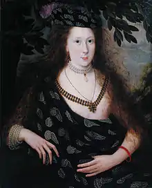 In the same year, Peake also painted his first portrait of James I's only surviving daughter, Elizabeth. This work, like the double portrait, for which it might be a companion piece, appears to have been painted for the Harington family, who acted as Elizabeth's guardians from 1603 to 1608.[50] In the background of Elizabeth's portrait is a hunting scene echoing that of the double portrait, and two ladies sit on an artificial mound of a type fashionable in garden design at the time.[51]