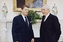 ![]() Schuller holding hands with President George W. Bush during a prayer at the homegoing celebration for Coretta Scott King at the New Birth Missionary Church in Atlanta in 2006 |
