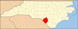 According to the U.S. Census Bureau, the county has a total area of 949.26 square miles (2,458.6 km2), of which 947.30 square miles (2,453.5 km2) is land and 1.96 square miles (5.1 km2) (0.21%) is water.[166][167] It is the largest county in North Carolina by area.[167][168] Owing to its large size, the county was historically sometimes referred to informally as the "State of Robeson".[169][170] It is bordered by the North Carolina counties of Bladen, Columbus, Cumberland, Hoke, and Scotland,[23] and the South Carolina counties of Dillon, Horry, and Marlboro.[167]