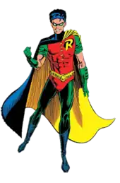 Robin is the alias of several superheroes appearing in American comic books published by DC Comics. The character was originally created by Bob Kane, Bill Finger, and Jerry Robinson, to serve as a junior counterpart and the sidekick to the superhero Batman. As a team, Batman and Robin have commonly been referred to as the Caped Crusaders and the Dynamic Duo.[1] The character's first incarnation, Dick Grayson, debuted in Detective Comics #38 (April 1940). Conceived as a way to attract young readership, Robin garnered overwhelmingly positive critical reception, doubling the sales of the Batman titles.[2] Robin's early adventures included Star Spangled Comics #65–130 (1947–1952), the character's first solo feature. He made regular appearances in Batman-related comic books and other DC Comics publications from 1940 through the early 1980s, until the character set aside the Robin identity and became the independent superhero Nightwing.
