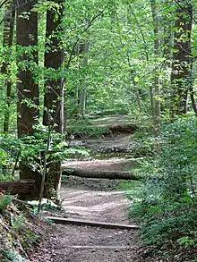 The Rock Creek Park Act authorized the purchase of no more than 2,000 acres (810 ha) of land, extending north from Klingle Ford Bridge in the District of Columbia (approximately the northern limit of the National Zoo), to be "perpetually dedicated and set apart as a public park or pleasure ground for the benefit and enjoyment of the people of the United States".[6] The Act also called for regulations to "provide for the preservation from injury or spoliation of all timber, animals, or curiosities within said park, and their retention in their natural condition, as nearly as possible".[7] Rock Creek Park is the oldest natural urban park in the National Park System.[8] Park construction began in 1897.[3]