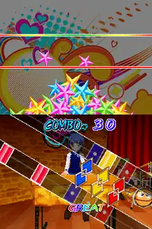 Players can also customize the character's outfits and instruments by purchasing them in the game's shop menus using points. Points are obtained clearing songs and collecting stars. Stars are piled up on the top screen as the player plays through a song. The better the score, the higher the stars will pile. If the stars reach past the top line, players will collect the stars by dragging the stylus at the end of each stage.