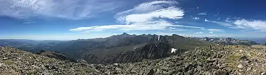 Region 2 is the alpine region of the park with accessible tundra trails at high elevations—an area known for its spectacular vistas.[36] Within this region is Mount Ida, with tundra slopes and a wide-open view of the Continental Divide. Forest Canyon Pass is near the top of the Old Ute Trail that once linked villages across the Continental Divide.[41]