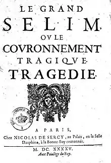 Cover page of Le Grand Selim, ou le couronnement tragique. (Paris, 1645), in-4°. (Paris BNF).